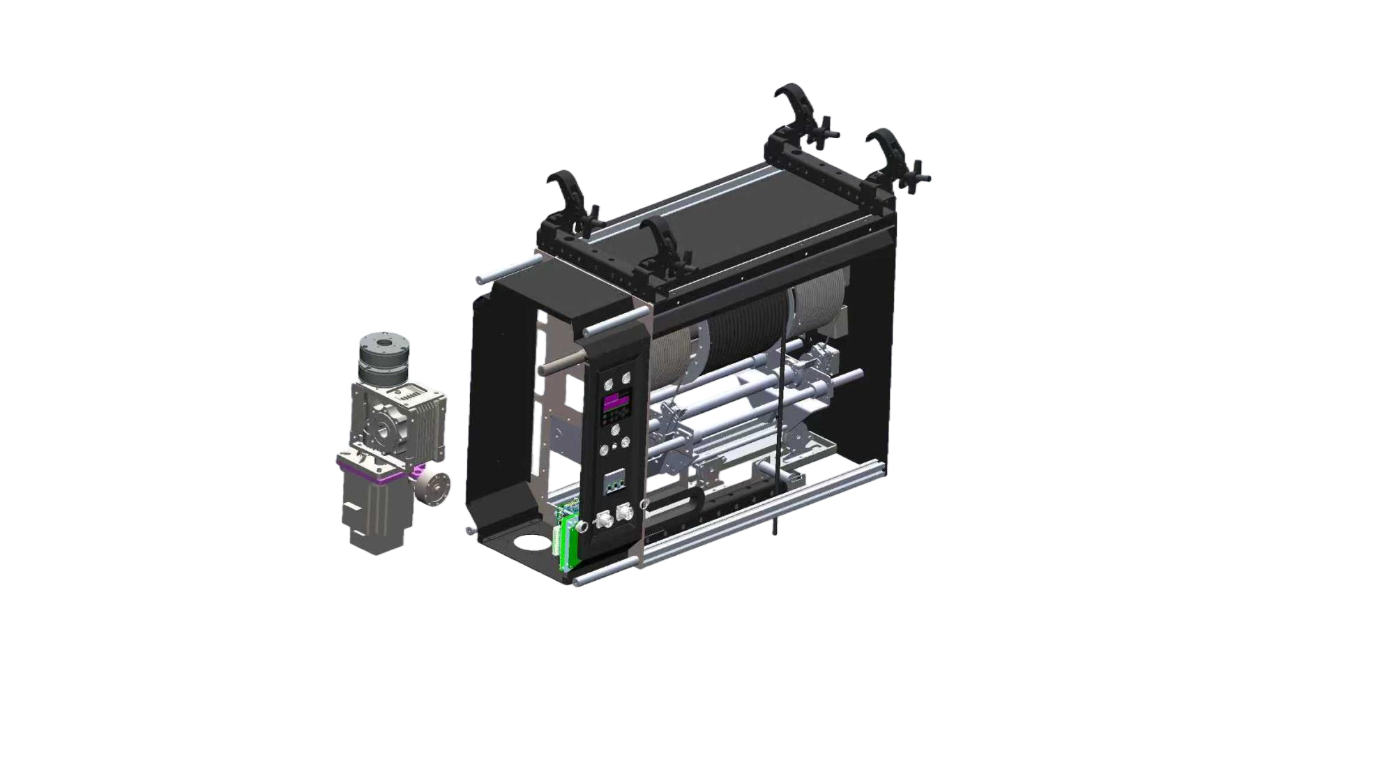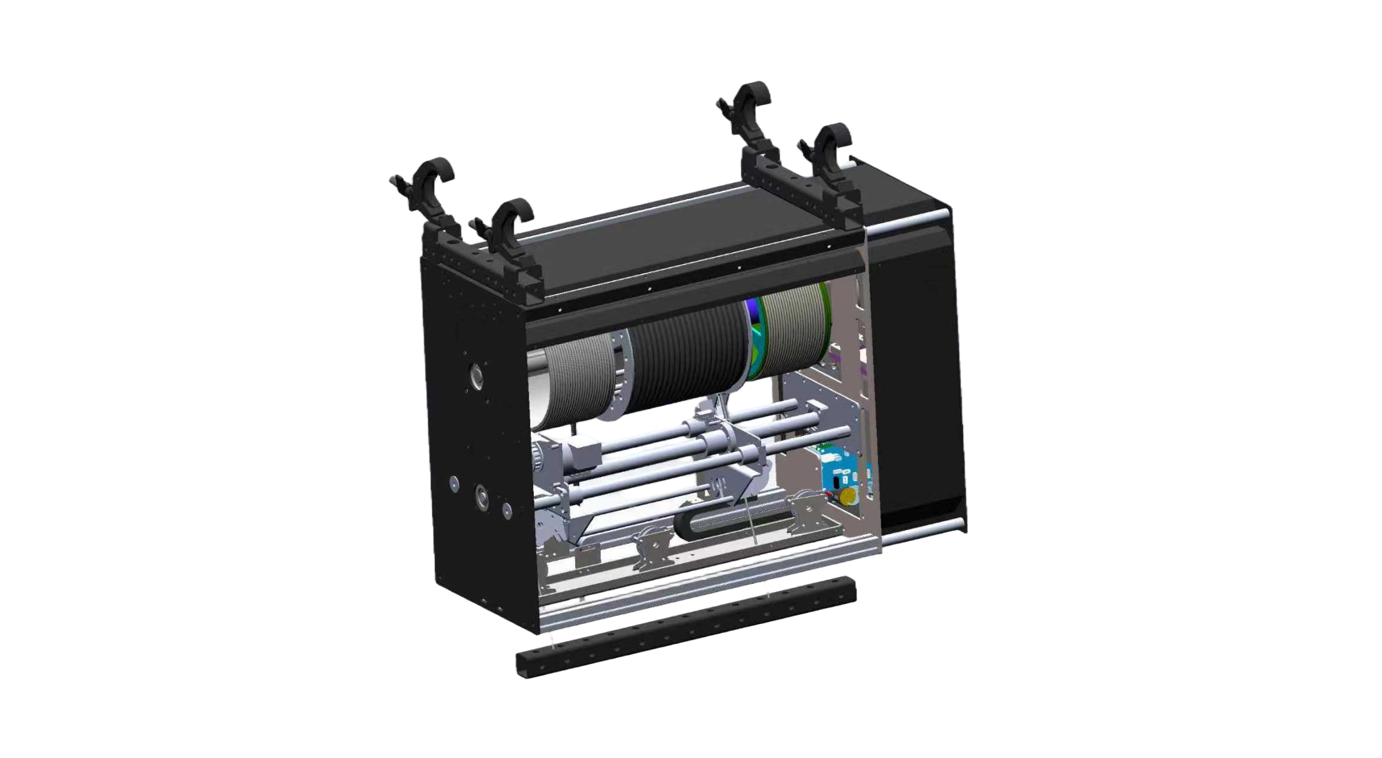 EXTRA-X DOUBLE Winch is a winch for stage use, mainly for use in theatres, shows and concerts. It lifts props and actors in and out of the stage sphere at a maximum load of 100 kg up and down. It requires only a power and data connection, has a built-in drive, and is controlled by IAC Kinetic Control System with Aurora Console.